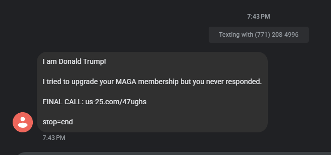 I just got this grifting text message from a bunch of pieces of shit that think this is an adequate way to advertise your political platform.